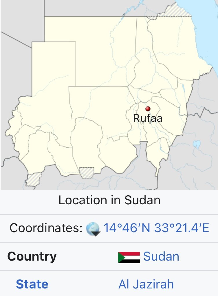 The city of Rufaa is located in Al Jazira state on the eastern banks of the Blue Nile. Rufaa is the birthplace of Boys and Girls Education in Sudan. It is where formal Education started in the Sudan when Shiekh Babiker Badri launched the first boys school in 1903. Soon after in 1907, he launched the first girls school in the country. Rufaa, the city, is populated by over 100,000 people. However, Rufaa, the district, has a population of over 300,000 people populating smaller towns and villages within the district. The people of Rufaa are highly educated and well-placed in both the public and private sectors.